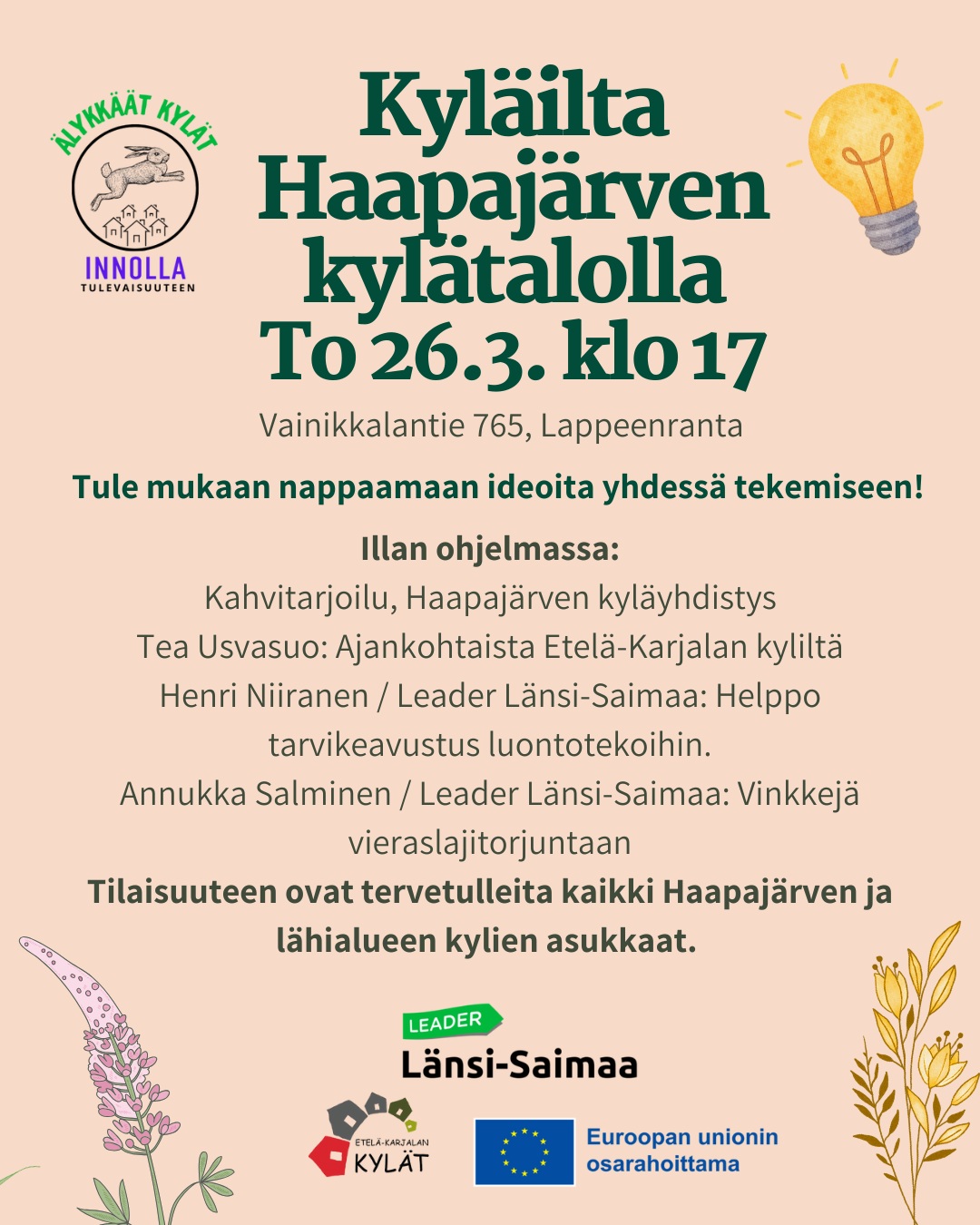 Tervetuloa kyläyhdistyksen kotisivuille. Ota yhteyttä, Reima Koivisto p. 050 505 0491, Pirjo Junnikkala p. 040 764 0649, haapajarvenkyla@gmail.com