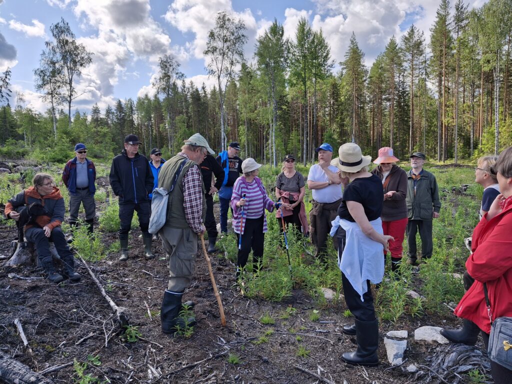 Seppo Vuokko opasti retkeläisiä luonnon ihmeisiin paloaukealla.