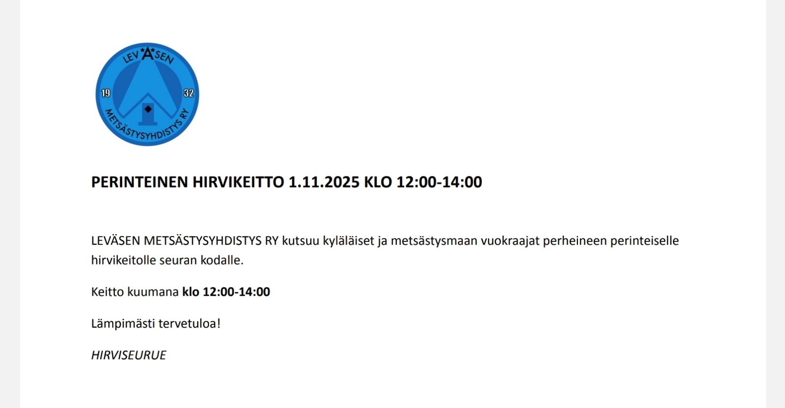 Leväsen seudun kyläyhdistys ry:n vuosikokous järjestetään torstaina 19.3.26 klo 17.30 alkaen kohtaamispaikka Luodossa Saimaanharjulla.