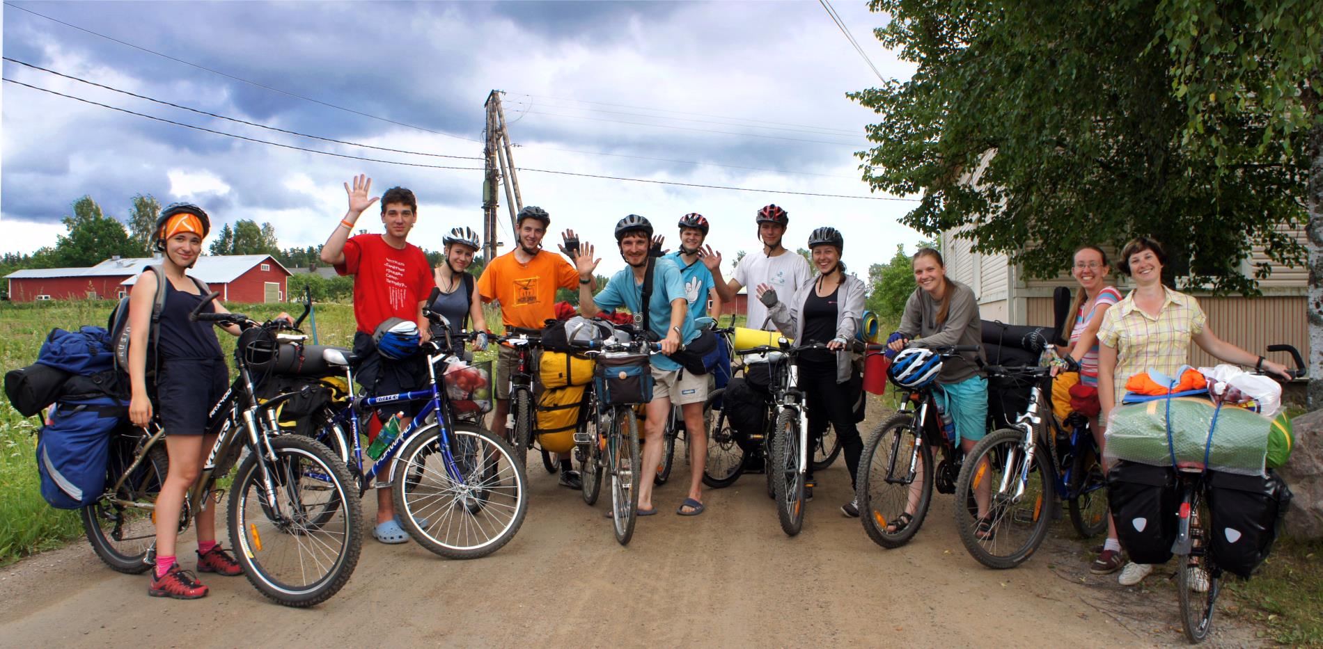 Pyöräily on kasvattamassa suosiotaan eri puolilla maailmaa, niin maalaisten kuin kaupunkilaistenkin keskuudessa. Lämpimänä heinäkuisena sunnuntai-iltana oli ryhmä iloisia pietarilaisnuoria päättämässä Imatran ja Mikkelin kautta suoritettua Saimaan ympärireissuaan. Aikomuksena oli vielä yöpyä Saimaan rannalla ja jatkaa sitten Lappeenrannan kautta takaisin kotiin. Keskellä eturivissä sinisessä paidassa retken johtaja Evgeniy ja ryhmän tulkkina toiminut Sonya (kolmas oik.) (Klikkaa kuva isommaksi)