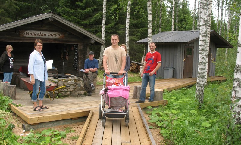 Karvajalanjoen uutta luontopolkua testattiin etukäteen venäläisten vieraiden lastenrattailla. Vasemmalla edessä Karvajalanjoen suojeluyhdistyksen varapuheenjohtaja Maija Saikko ja takana istuskelee hankevastaava Osmo Pöysti. Kuva: Marjut Sassi