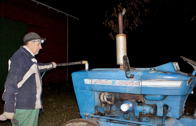 Hätä keinot keksii. Peltoilainen Sulo Kannelniemi näyttää, kuinka Fordin ilmanottoaukkoon teipatun letkun avulla saadaan navetan lypsykoneisiin tarvittava imu.