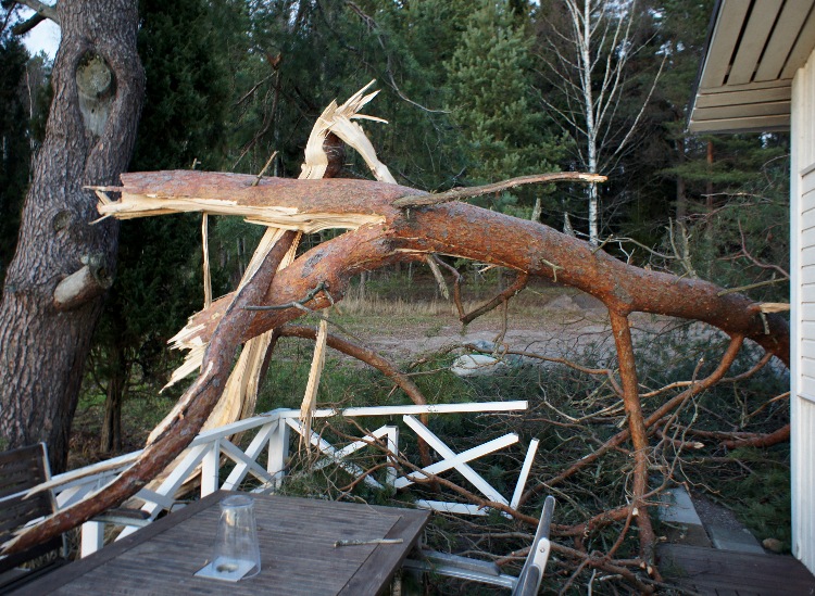 Maaveden koillisrannalla vanha petäjä taipui luovuttamaan suuren oksan Einon voiman edessä. Mökki säästyi niukka naukka vahingoilta.