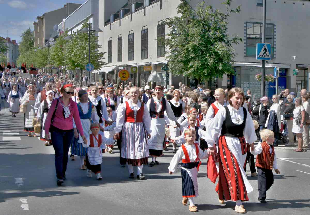 2014-06-15 Lappeenranta. Karjalaiset Kesäjuhlat Lappeenrannassa värittivät ja virittivät kesäkaupungin menoa viikonloppuna. Sunnuntain karjalan kansan messu täytti Marian kirkon ääriään myöten ja juhlamarssi soljui kaupungin halki iloisen laulun ja yleisön taputusten siivittämänä kohti juhlakenttää. Entisissä Tekun Pohjolankadun tiloissa myytiin rinkeleitä, tuohi- ja puuesineitä, vaatteita, kirjoja ja monenlaista muuta tavaraa. Sukujuuristaan kiinnostuneet saivat asiantuntijoilta apua ja vinkkejä. Ja ennenkaikkea haastella helskytettiin.