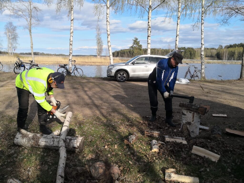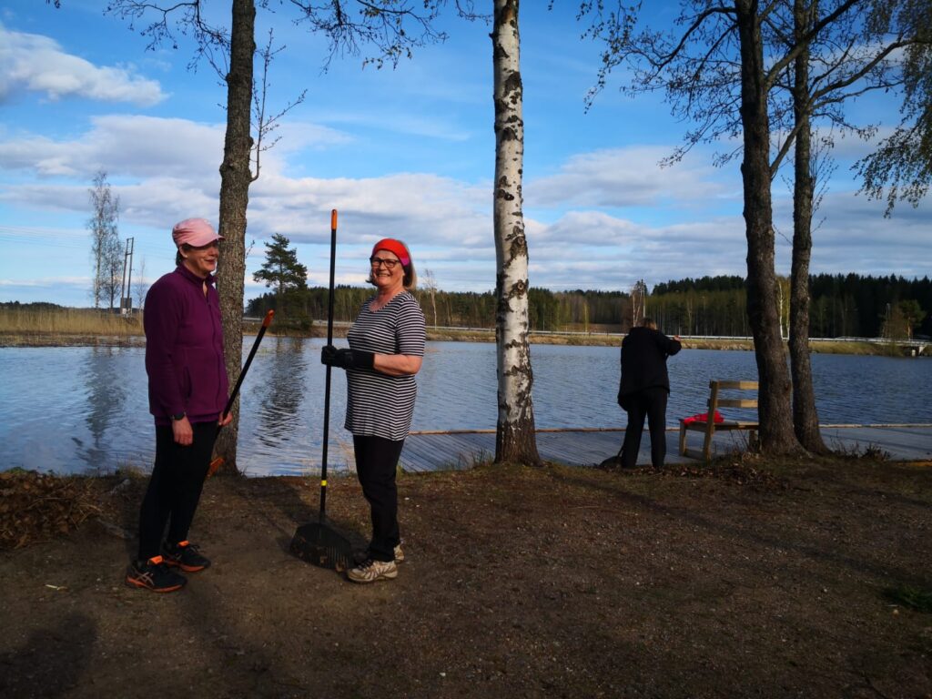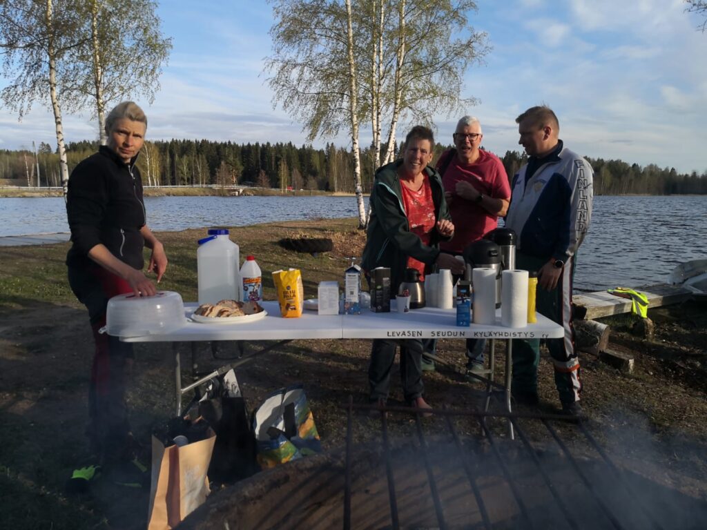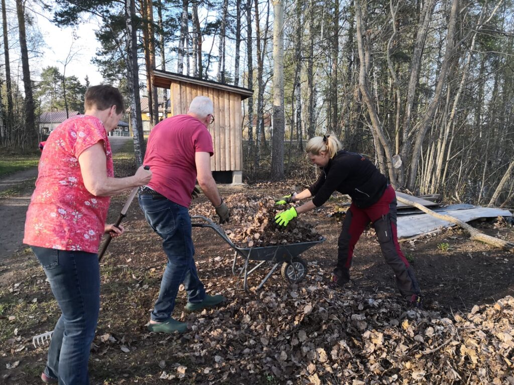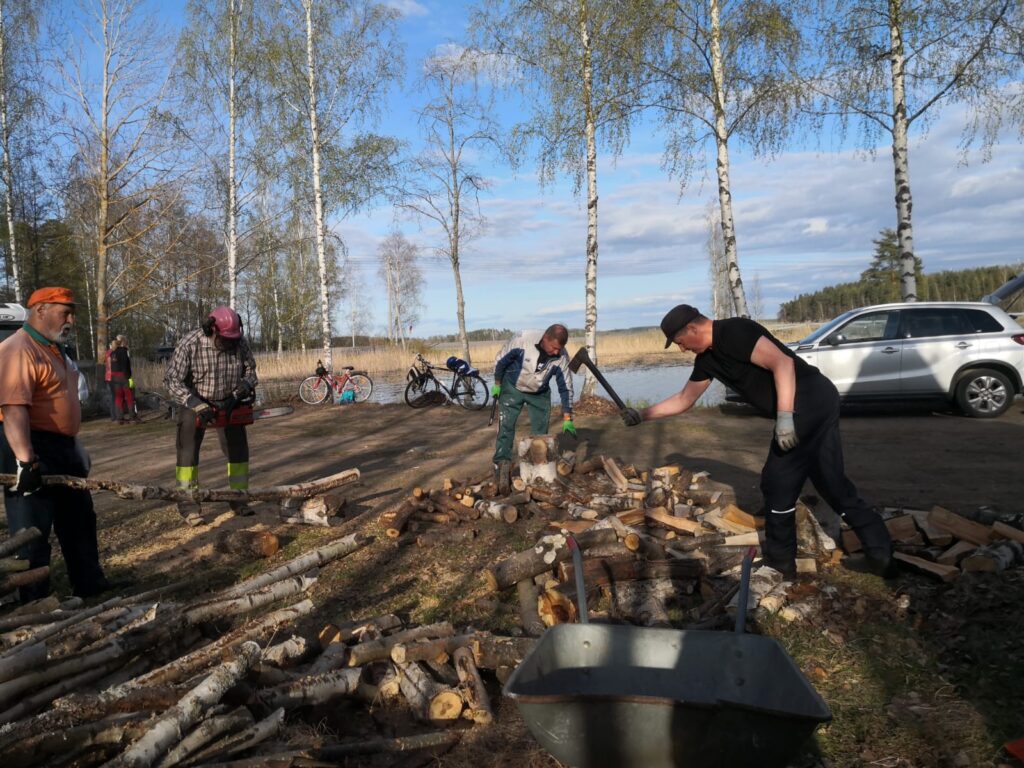 Talkookutsu oli tavoittanut peräti 18 hengen innokkaan porukan kyläyhdistyksen talkoisiin Leväsen rannassa. Haravat heiluivat, moottorisahat soivat, kirveet iskivät kerta toisensa jälkeen välillä tiukkoihinkin pölleihin ja kottikärrein klapit kuljetettiin suojaan pinoon kuivumaan. Taukopaikalla tulen lämpö kuivatti hikisiä talkoolaisia ja paistoi myös makkarat. Taukopaikalla maistui makkara, mehu ja kahvi, ja iloinen puheensorina yhdistyi kevätlintujen lauluun. Yhdistys kiittää kauniisti kaikkia talkoisiin osallistuneita. And a special thanks to Marijke and Nico from Beverwijk Holland for volunteering to join our village team and showing such great enthusiasm yesterday evening. Hope to see you back at Levänen sometime again. (We`ll send you a to-do list in advance …)