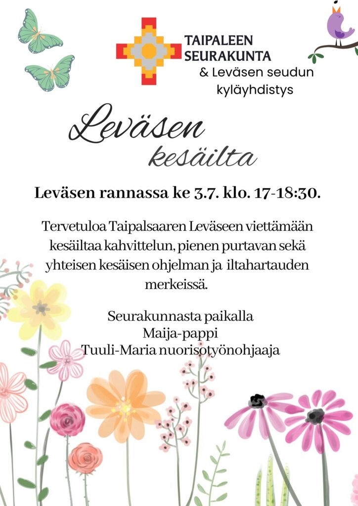 Leväsen seudun perinteinen kyläilta yhteistyössä Taipaleen srk:n kanssa on keskiviikkona 16.8.2022 klo 17.30-19.30 Leväsen uimarannan alueella.