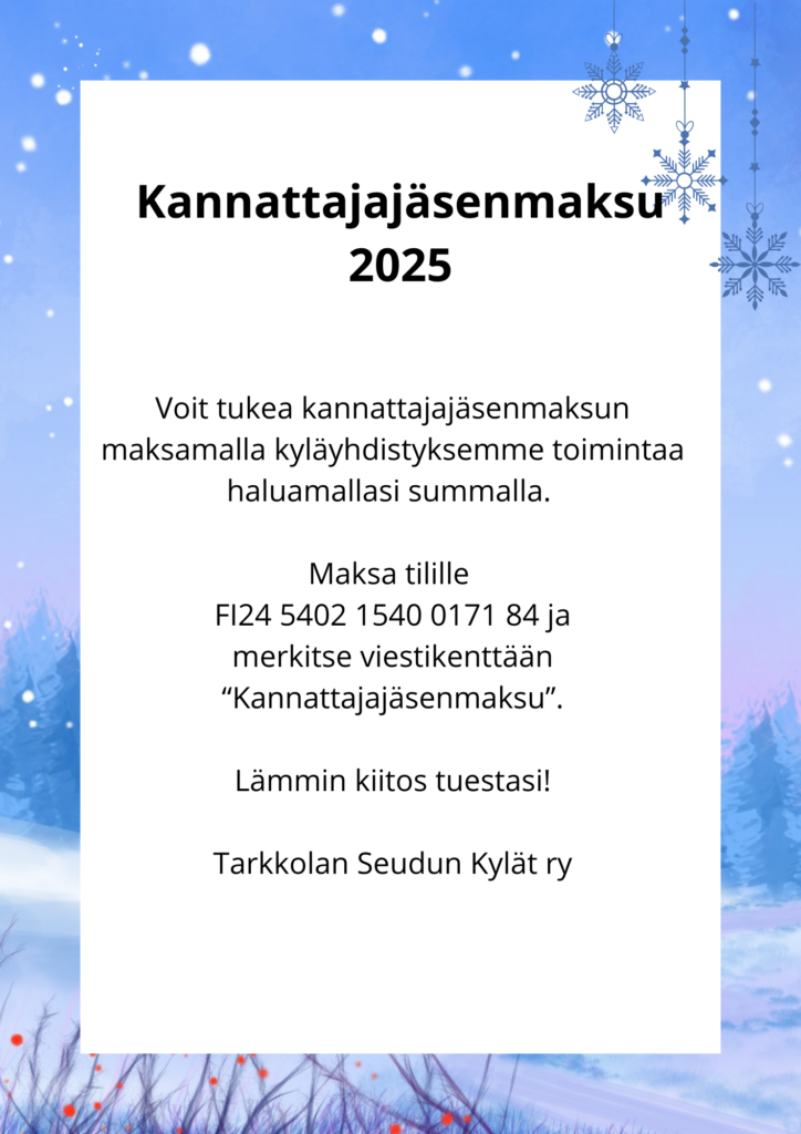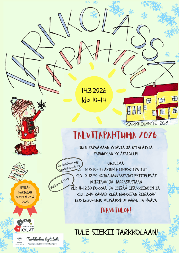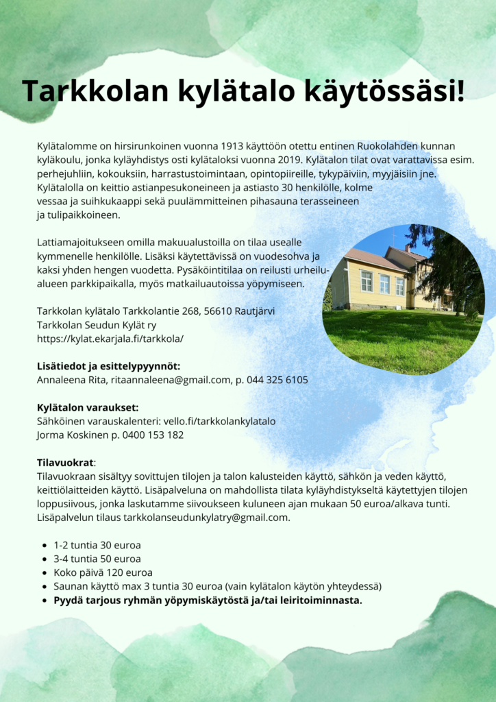 Tarkkolan seudun kylät ry Tutustu Tule siekii Tarkkolaan! Tarkkolan teatterikesä 2026 Kylätalon sähköinen varauskalenteri Voit varata kylätalon käyttöösi Vello.fi-palvelusta. Varauspalvelun linkin löydät välilehdeltä Tarkkolan kylätalo. Voit myös tehdä varauksen kopioimalla selaimeesi vello.fi/tarkkolankylatalo. Kylätalon sähköinen varauskalenteri Talokansiosta löydät ohjeet varaajalle, järjestyssäännöt ja tilaluettelon. Lue talokansio välilehdeltä Tarkkolan kylätalo. Kylätalo-sivulle tästä