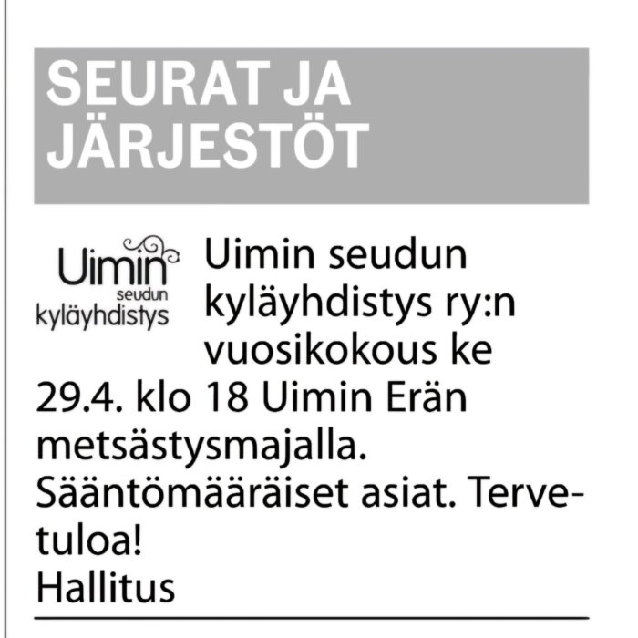 Uimin Seudun kyläyhdistys ry:n vuosikokous ke 26.4. klo 18 Uimin Erän metsästysmajalla. Sääntömääräiset asiat. Tervetuloa!