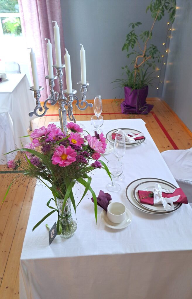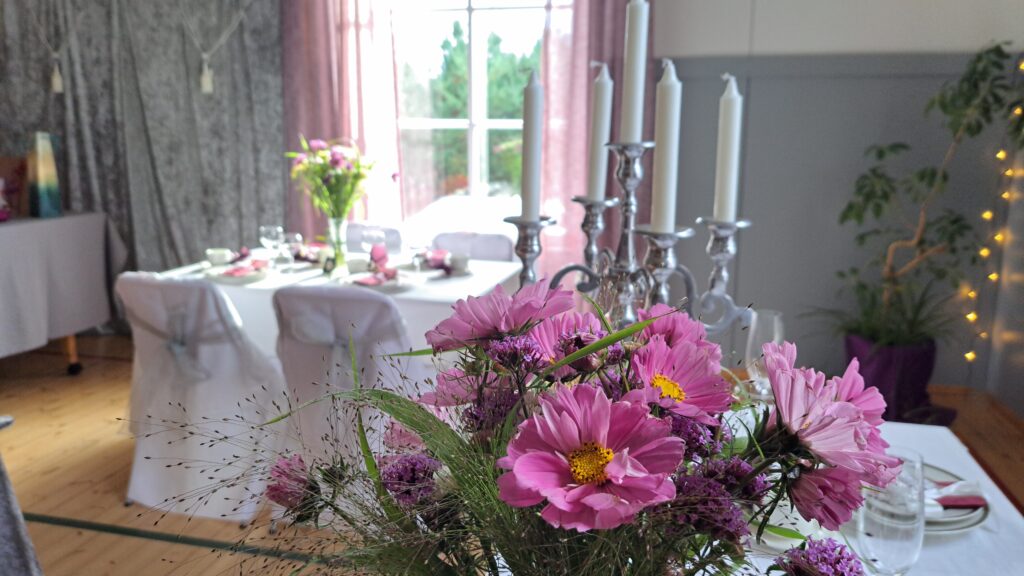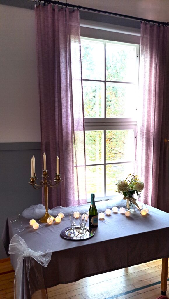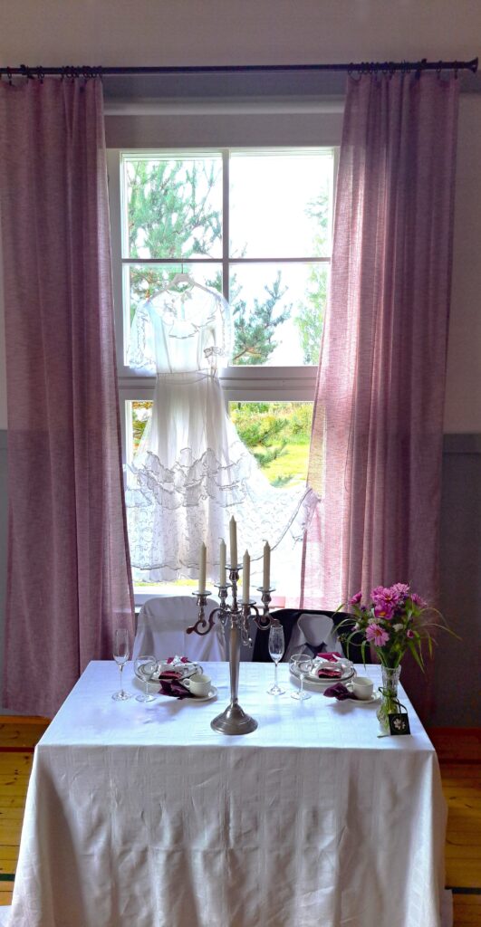 Männistössä oli näytteillä erilaisia hääkattauksia, joista voimme ottaa inspiraatiota tuleviin juhliimme. Näimme konkreettisesti sen, miltä Männistön voi saada näyttämään! Kukat meille toimitti Virtakallion tila.
