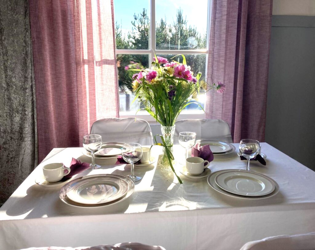 Lopputulos on rauhallinen ja tyylikäs. Olemme päivittäneet uuteen tyyliin myös verhot ja pöytäliinat.