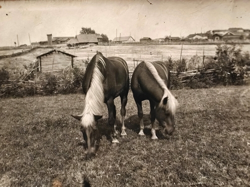 Antti Mikkolan hevoset Poju ja Reku laitumella 1940-luvun alussa.